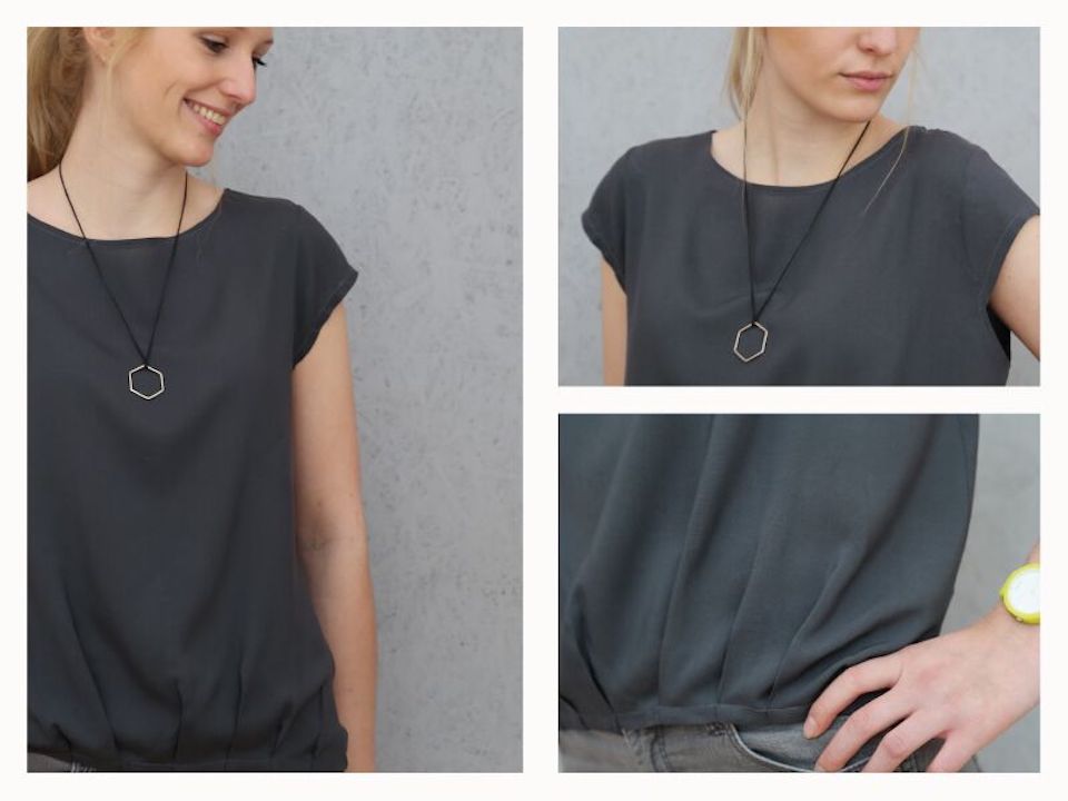 Fortgeschrittenen Nähanfänger können sich mit der ausführlich bebilderten Schritt-für-Schritt-Anleitung eine leger geschnittene Bluse nähen. Der Saum ist nach hinten leicht verlängert. Das Vorderteil ist mit Falten versehen. Die Ärmel können lang, 3/4 oder kurz sein.
