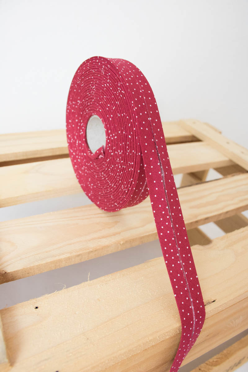 Wunderschönes Schrägband in rot weiß mit unregelmäßigen Punkten von Westfalenstoffe AG.