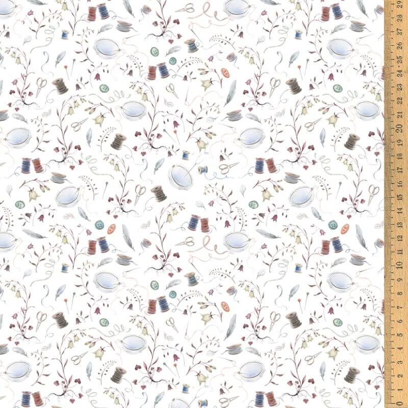 Fadenpoesie Die Kunst der Handarbeit auf Stoff gebannt. Mit dem Stoff Fadenpoesie aus der Kollektion My Dear Jane feiern wir die Romantik und Schönheit der Handarbeit. Sophia Drescher hat hier eine liebevolle Hommage an die Kunst des Nähens und Stickens geschaffen. Der Stoff zeigt nicht nur die filigranen Werkstücke der Handarbeitskunst, sondern auch die Materialien, die dabei zum Einsatz kommen. Zwischen zarten Blüten und feinen Federn entdecken Sie Garnspulen, Stickringe, Scheren, Nadeln und Knöpfe, eingerahmt von Nadel und Faden. Diese harmonisch arrangierten Motive formen ein zauberhaftes All-Over-Design, das Tradition und Eleganz miteinander vereint. Fadenpoesie ist ein vielseitiger Begleiter, der sich ideal für kleinteilige Näharbeiten wie Patchwork oder English Paper Piecing eignet. Doch auch größere Projekte wie Kissen, Taschen oder Tischläufer profitieren von seiner romantischen Ausstrahlung. Besonders schön lässt sich der Stoff mit anderen Designs aus der My Dear Jane-Kollektion kombinieren, um individuelle und stimmige Werke zu schaffen. Lassen Sie sich von Fadenpoesie inspirieren und verleihen Sie Ihren Projekten die Anmut und Liebe zum Detail, die diese Hommage an die Handarbeitskunst ausstrahlt. Ein Stoff, der Geschichten erzählt von Kreativität, Geduld und der Freude am Gestalten.
