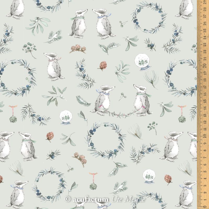 Traumhafter Baumwollstoff Wintergrün und Dachse von Sophia Drescher / Acufactum. Die Stoffe von acufactum zeichnen sich durch die hochwertigen Designs und den außergewöhnlich schönen Druck aus... das ist etwas ganz Besonderes und zum wirklich, wirklich Liebhaben!